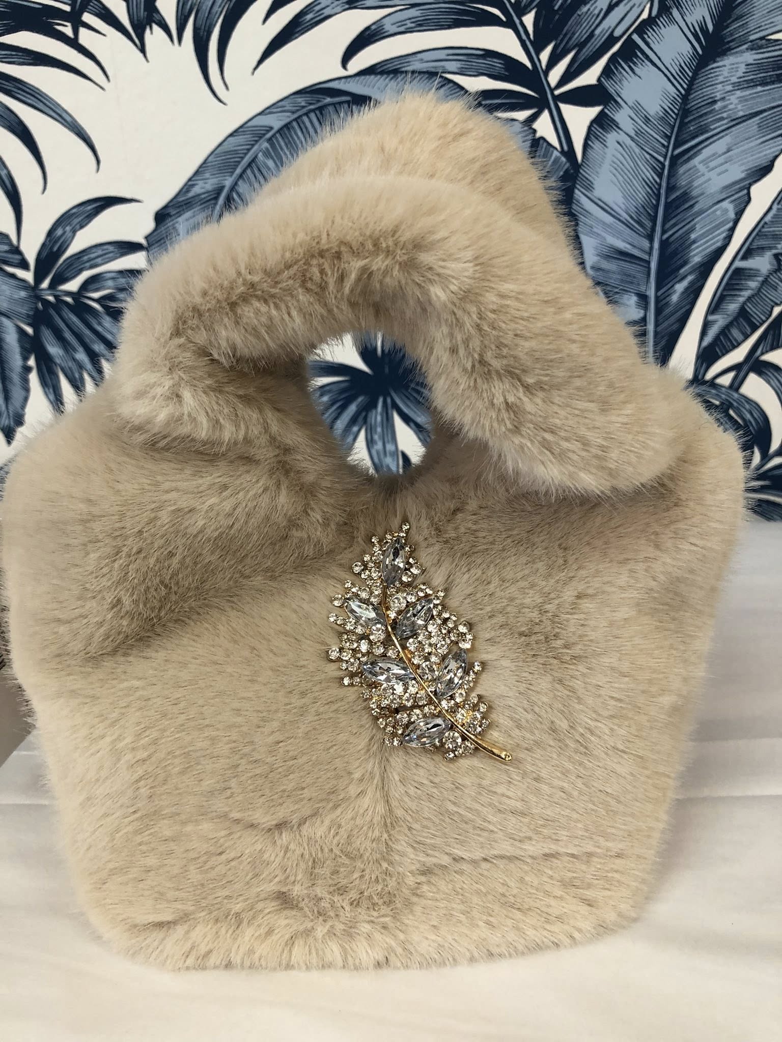 • This compact loop bag features luxurious faux fur in two colorways, anchored by a distinctive embellished broach that serves as both closure and statement detail.